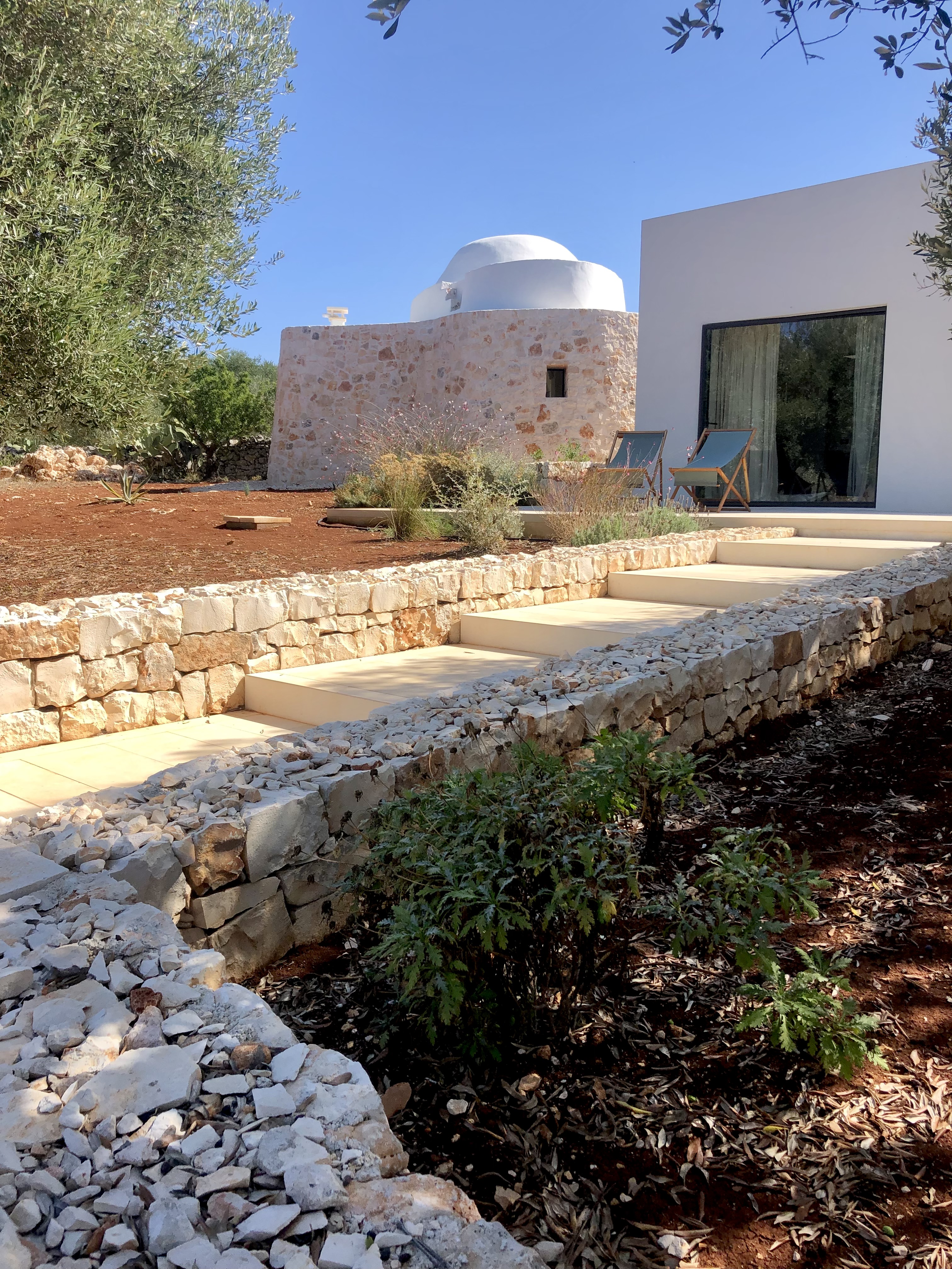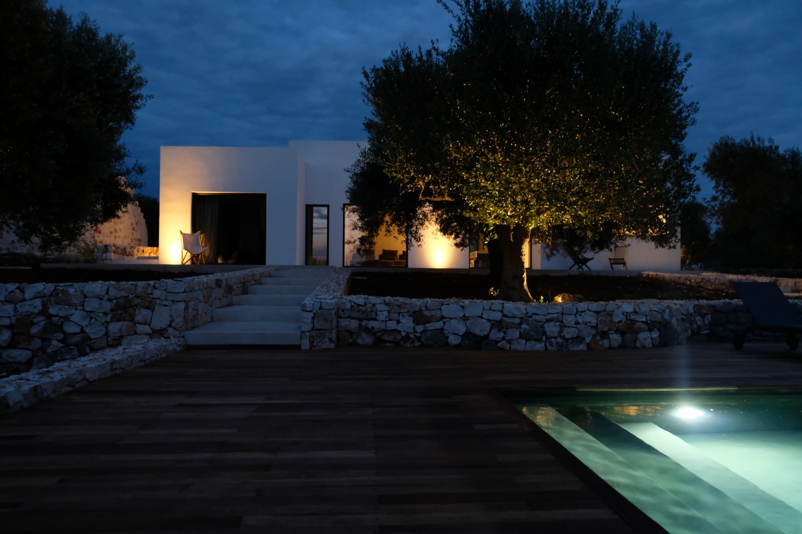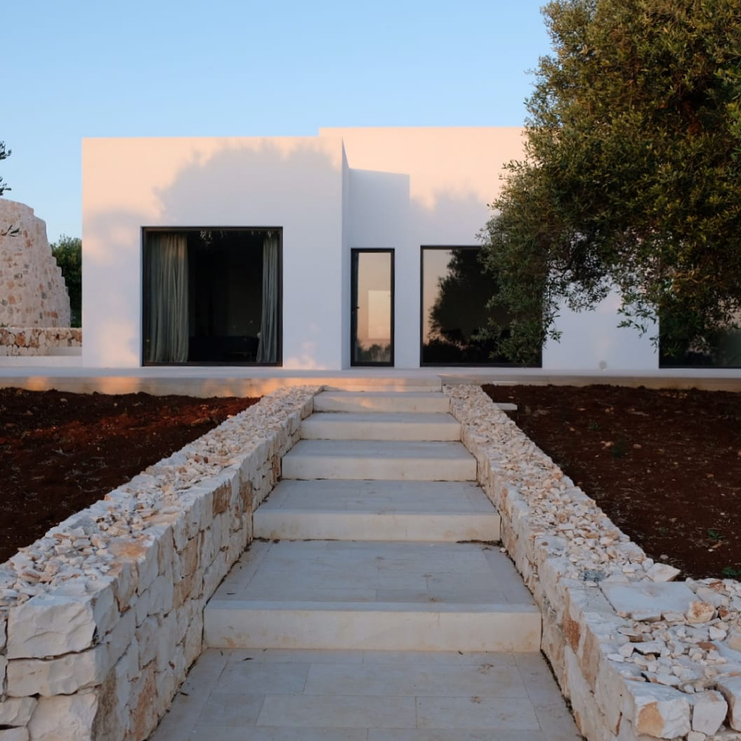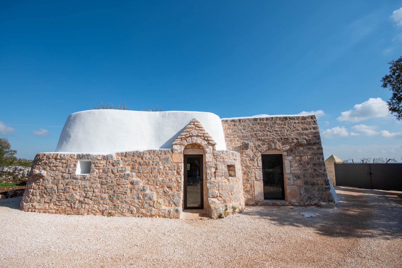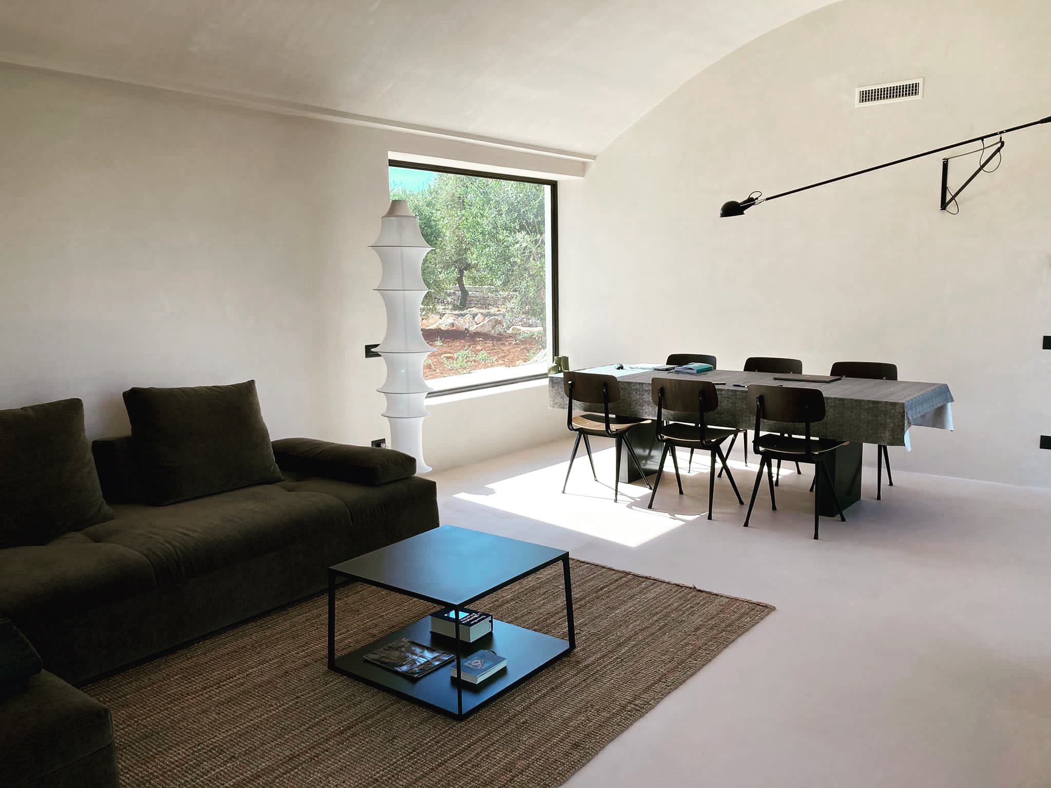 La proprietà comprende una casa di nuova costruzione, un trullo adiacente e altri due trulli situati poco più distanti. La nuova abitazione si affianca armoniosamente al trullo esistente, senza sovrastarlo: un equilibrio rispettoso, dove l’architettura contemporanea dialoga con la tradizione. Gli elementi architettonici, i materiali scelti e la palette cromatica creano continuità tra interno ed esterno, rendendo naturale e delicato il passaggio tra antico e moderno. Le ampie vetrate incorniciano il paesaggio come quadri viventi, aprendo la casa alla luce e alla bellezza della Valle. Materiali come la pietra, il ferro e il legno reinterpretano in chiave contemporanea gli elementi tipici della tradizione locale, mentre i colori li amalgamano e li armonizzano con eleganza.