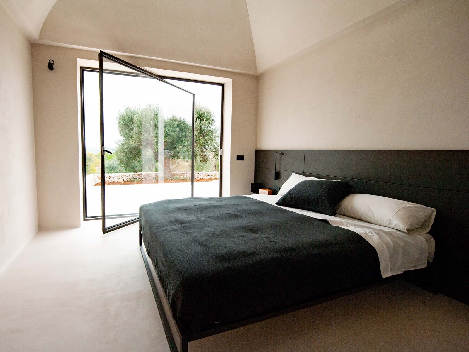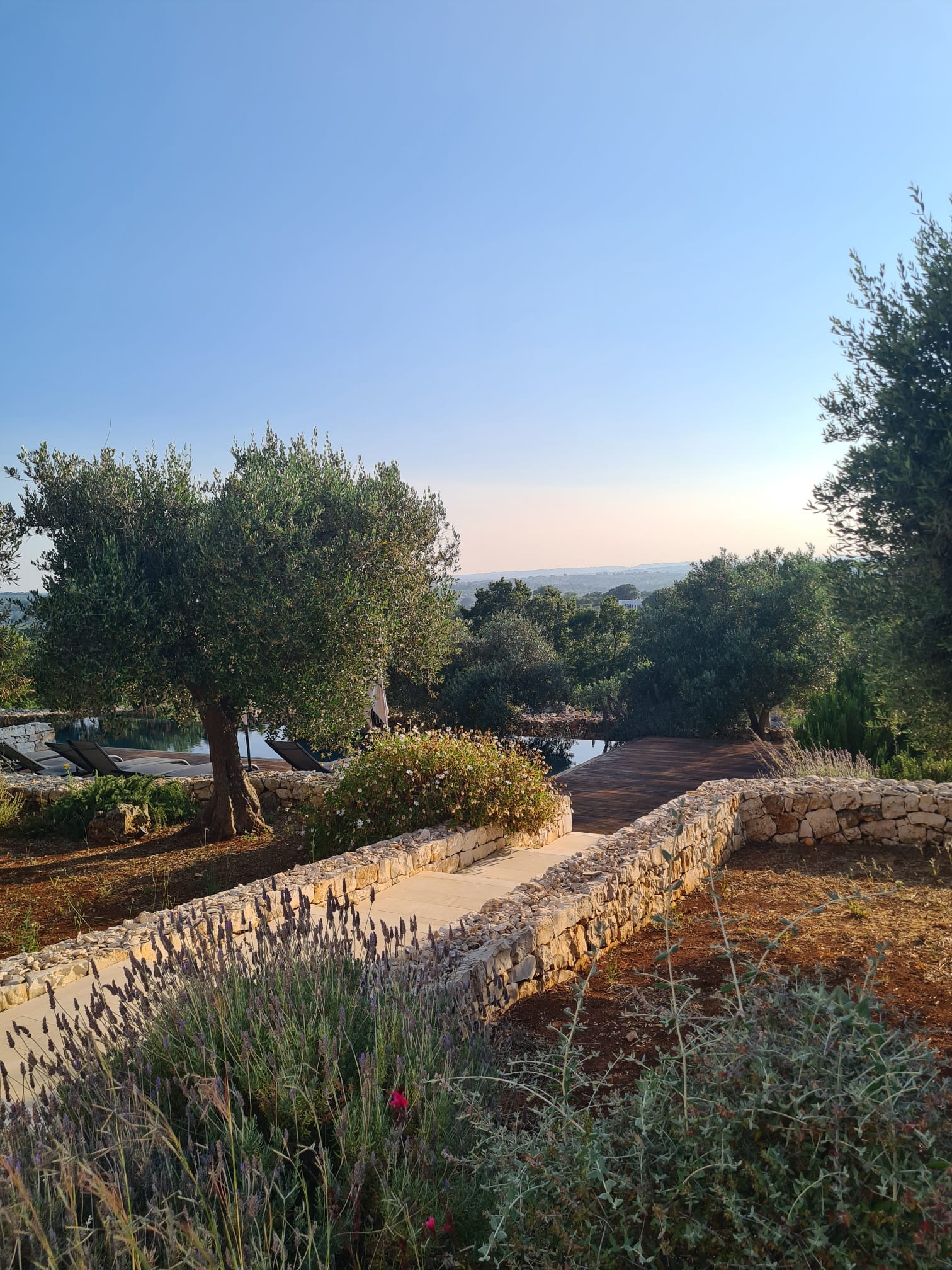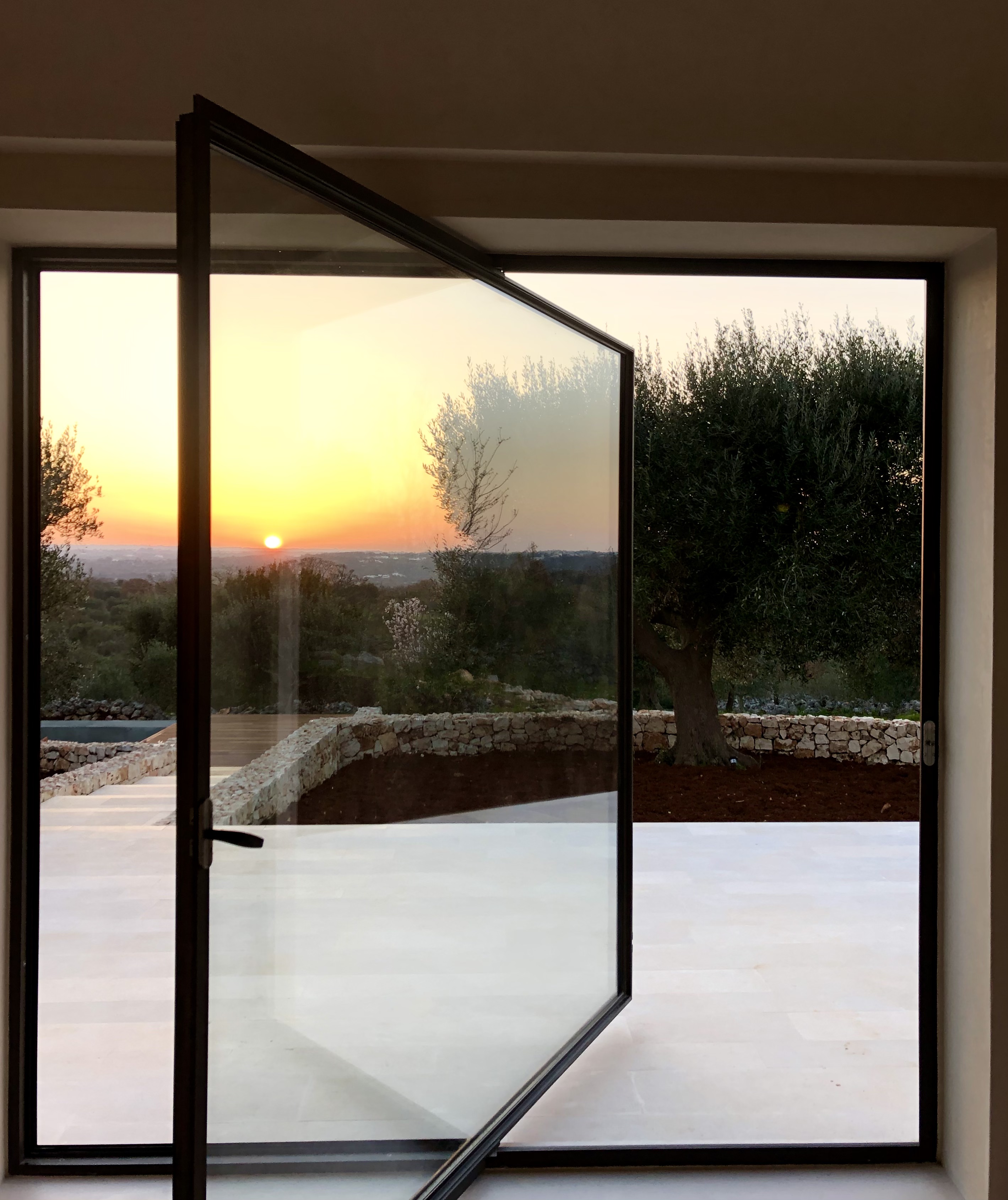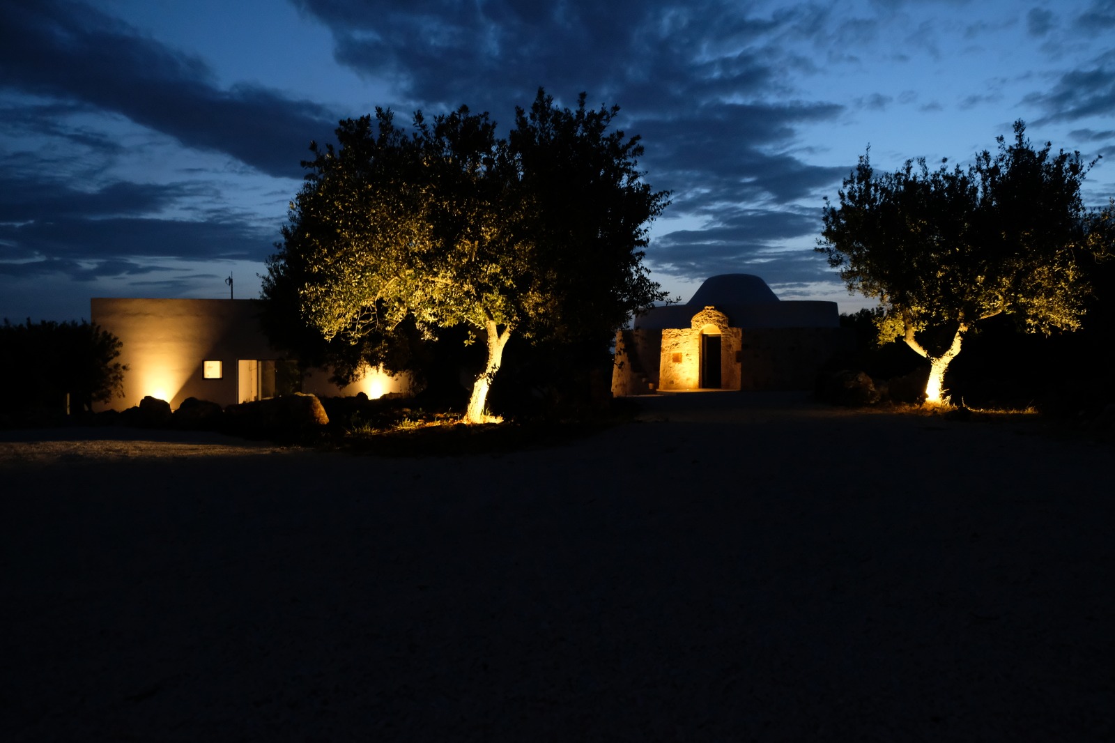 La proprietà comprende una casa di nuova costruzione, un trullo adiacente e altri due trulli situati poco più distanti. La nuova abitazione si affianca armoniosamente al trullo esistente, senza sovrastarlo: un equilibrio rispettoso, dove l’architettura contemporanea dialoga con la tradizione. Gli elementi architettonici, i materiali scelti e la palette cromatica creano continuità tra interno ed esterno, rendendo naturale e delicato il passaggio tra antico e moderno. Le ampie vetrate incorniciano il paesaggio come quadri viventi, aprendo la casa alla luce e alla bellezza della Valle. Materiali come la pietra, il ferro e il legno reinterpretano in chiave contemporanea gli elementi tipici della tradizione locale, mentre i colori li amalgamano e li armonizzano con eleganza.