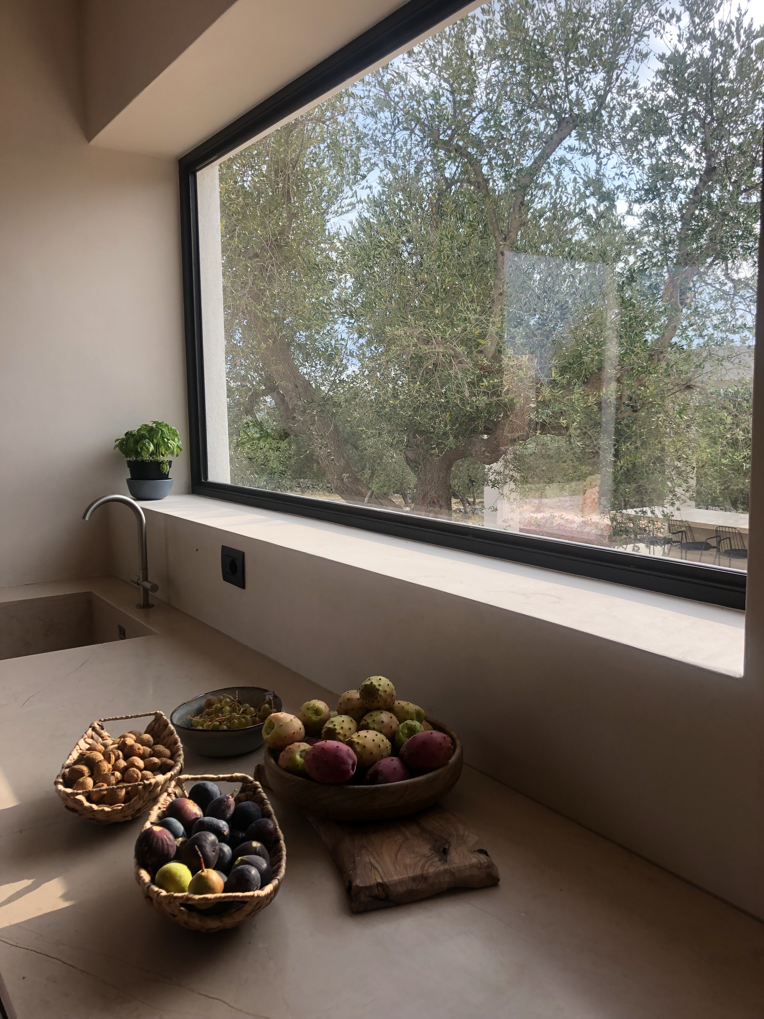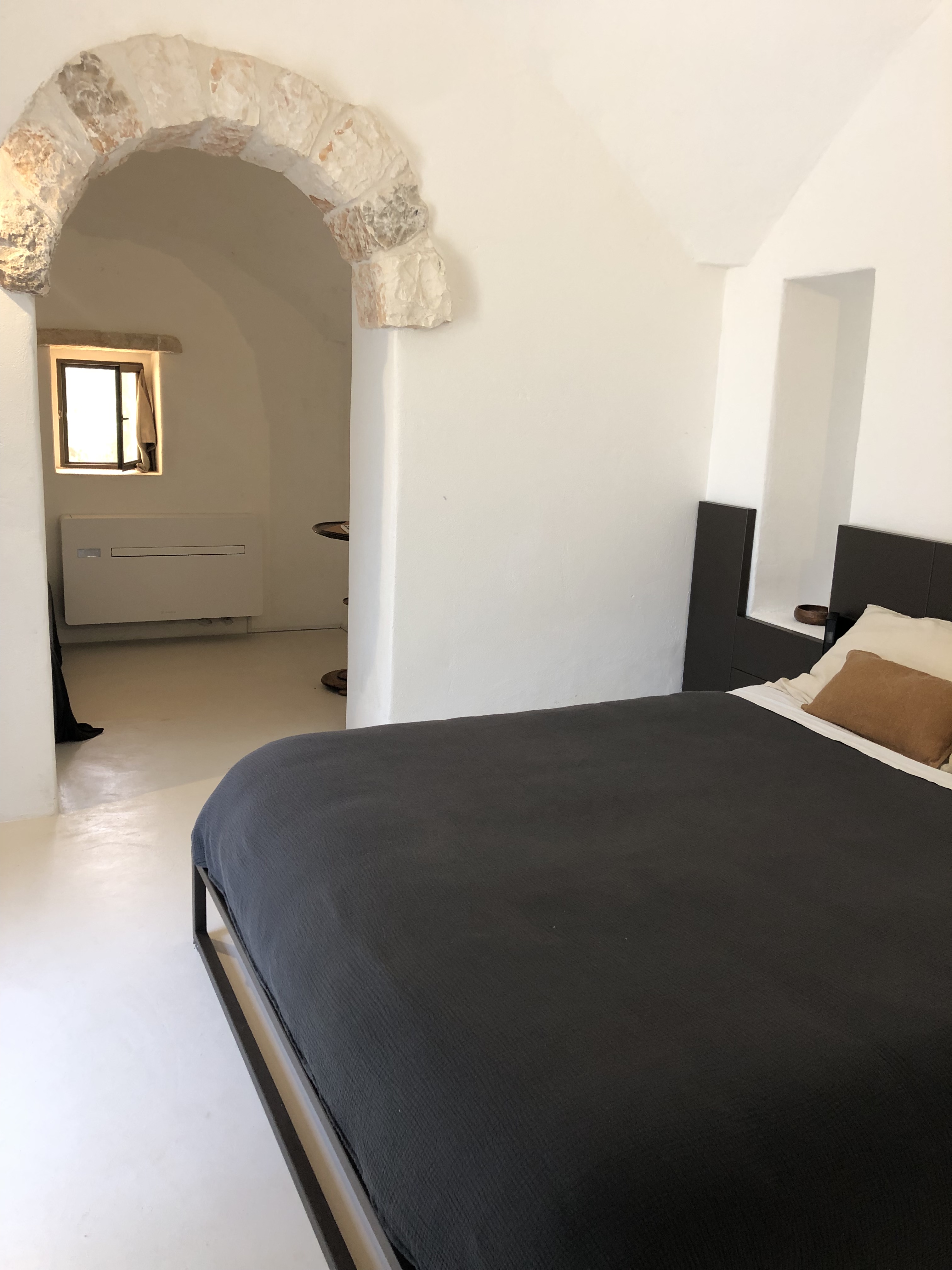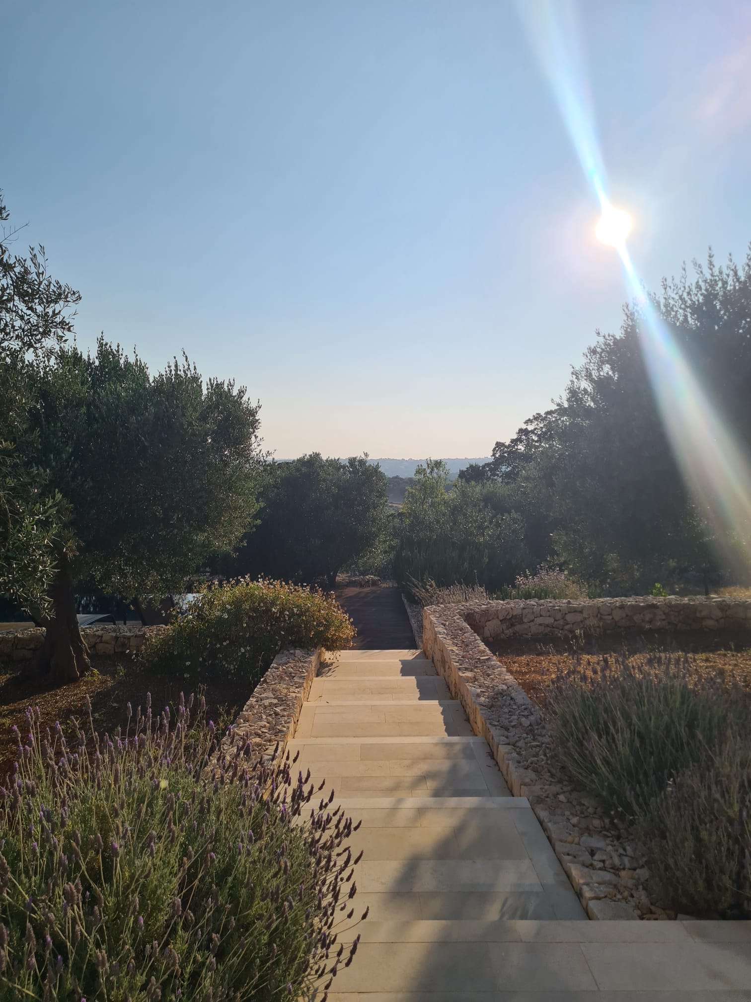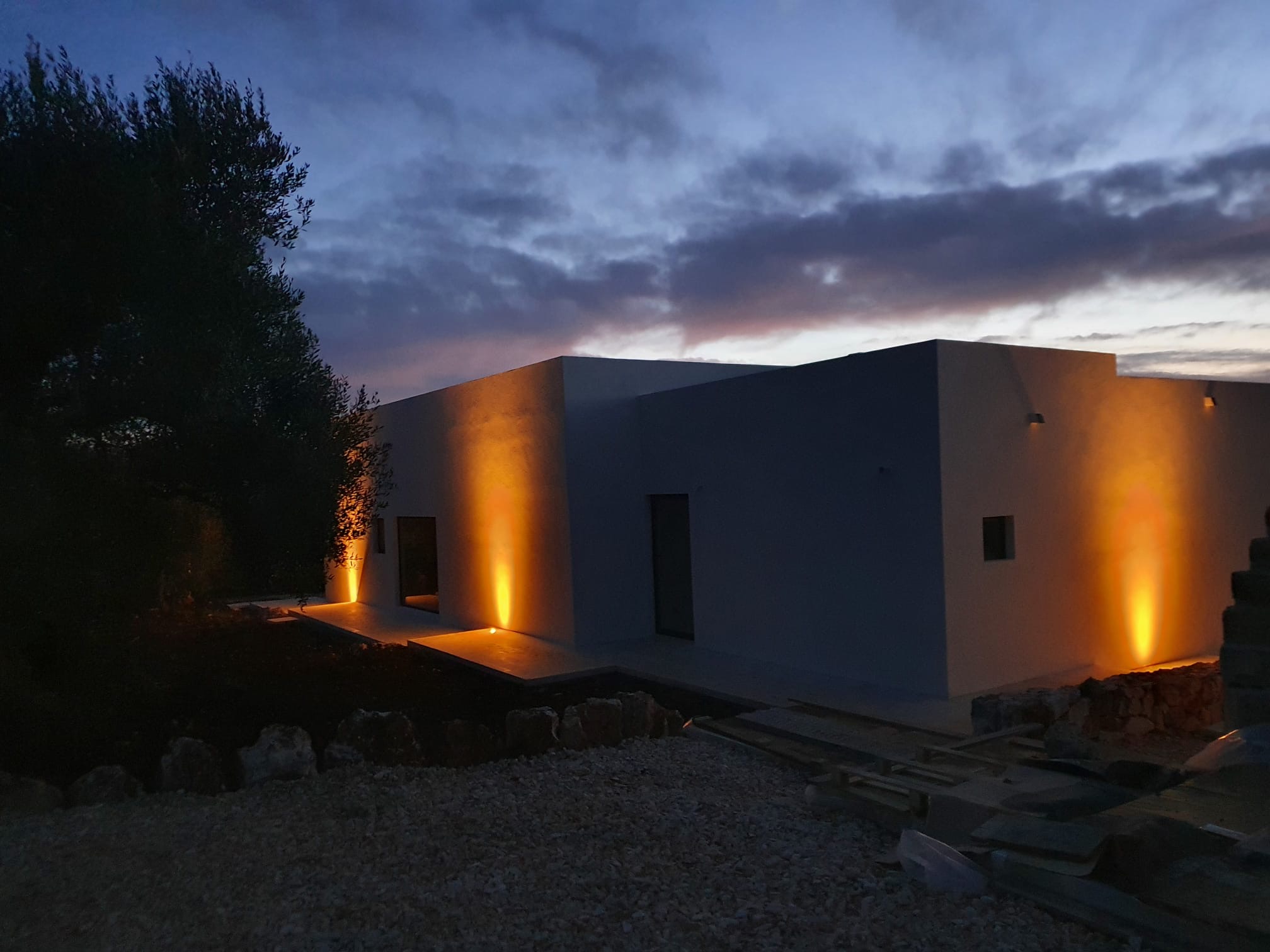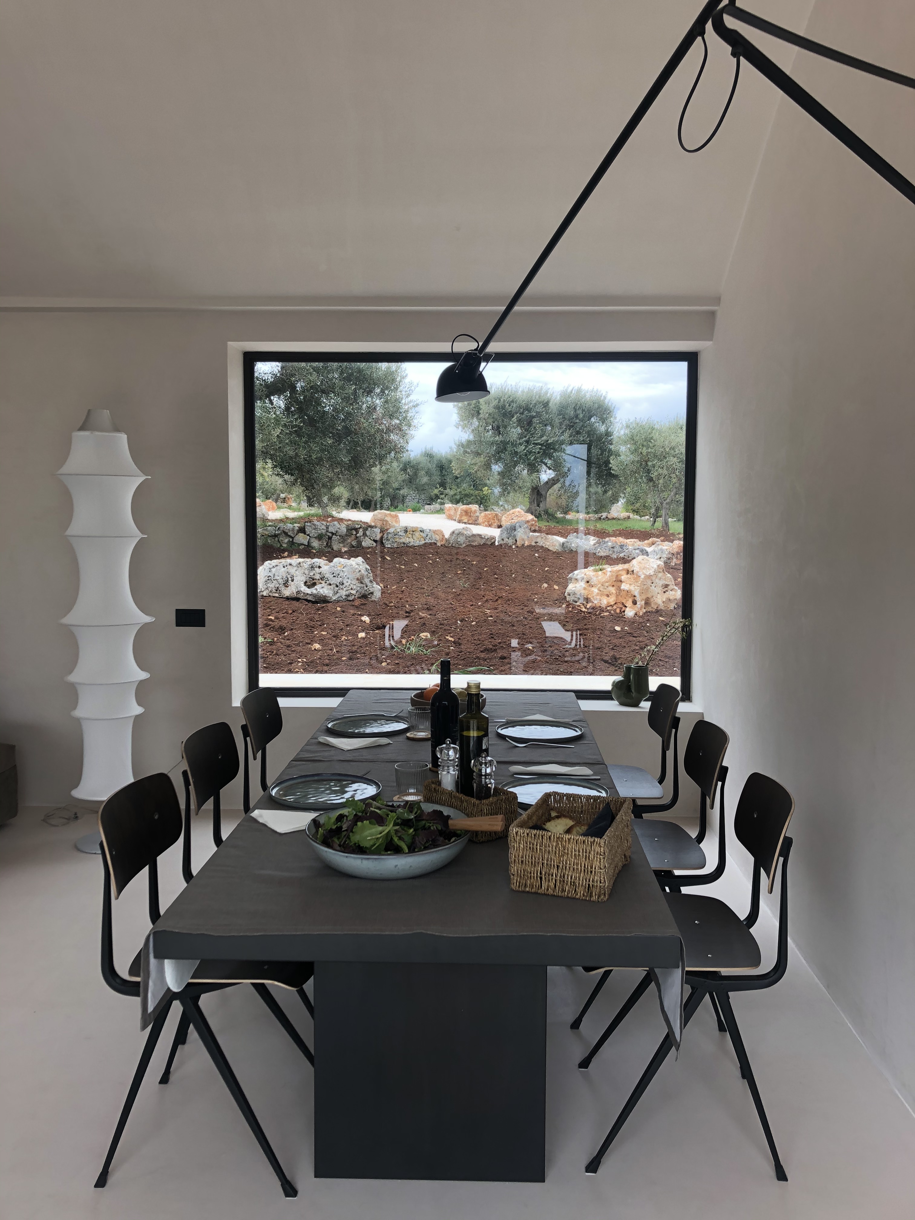 La proprietà comprende una casa di nuova costruzione, un trullo adiacente e altri due trulli situati poco più distanti. La nuova abitazione si affianca armoniosamente al trullo esistente, senza sovrastarlo: un equilibrio rispettoso, dove l’architettura contemporanea dialoga con la tradizione. Gli elementi architettonici, i materiali scelti e la palette cromatica creano continuità tra interno ed esterno, rendendo naturale e delicato il passaggio tra antico e moderno. Le ampie vetrate incorniciano il paesaggio come quadri viventi, aprendo la casa alla luce e alla bellezza della Valle. Materiali come la pietra, il ferro e il legno reinterpretano in chiave contemporanea gli elementi tipici della tradizione locale, mentre i colori li amalgamano e li armonizzano con eleganza.