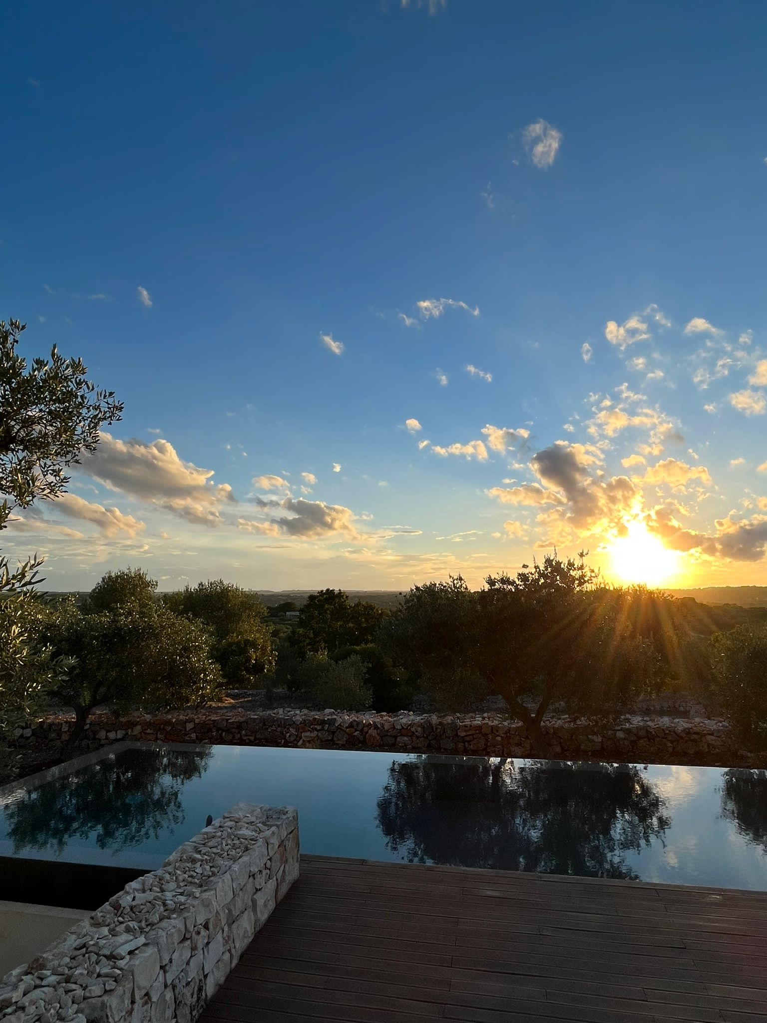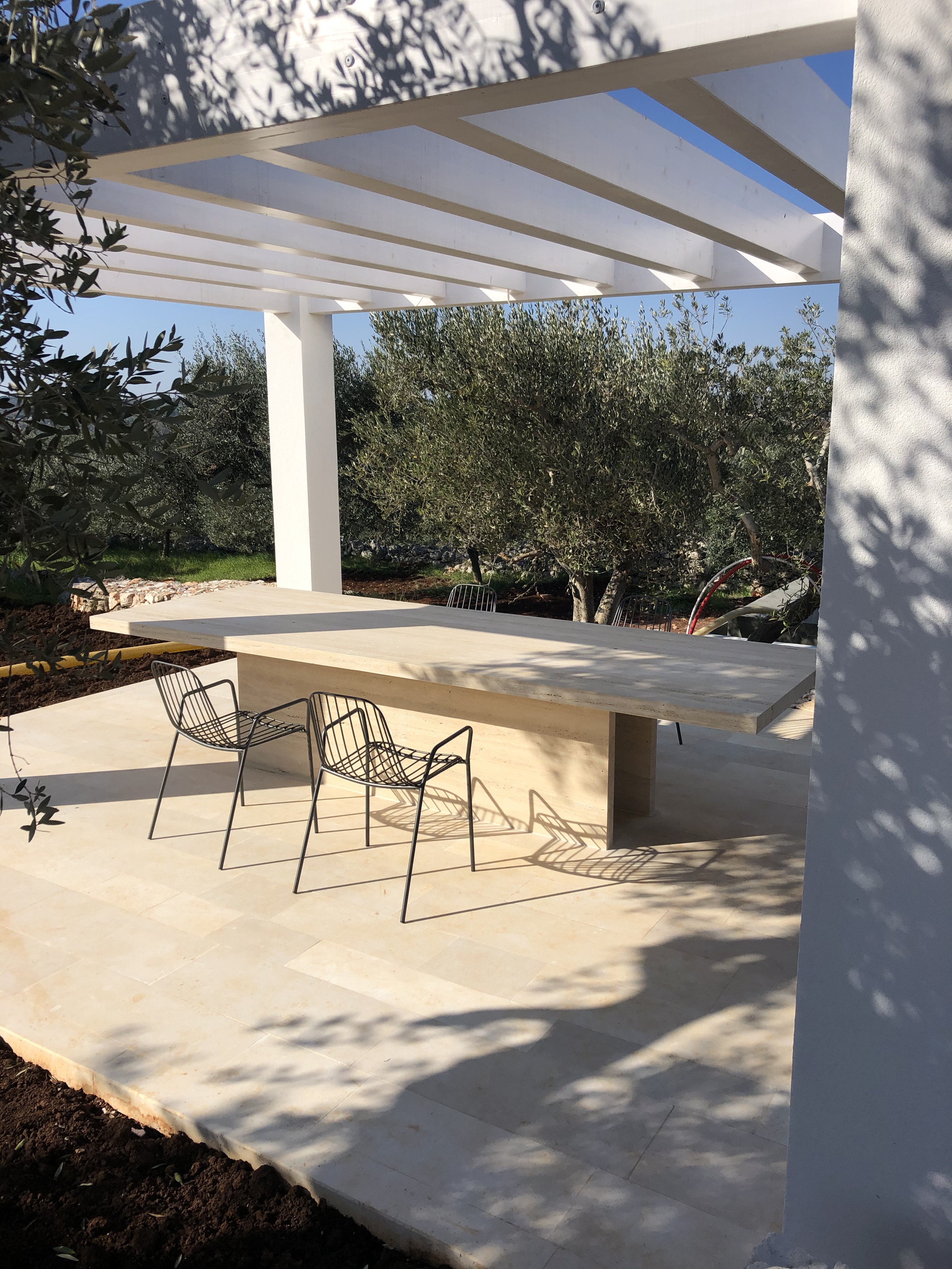 Through the large windows, the view opens onto beautifully integrated architectural elements: a pergola and an infinity pool that overlooks the valley in spectacular fashion.The new construction complements the trullo without overshadowing it. The architectural elements, materials, and colors chosen express continuity between the interior and exterior, creating a gentle transition between the old and the new.