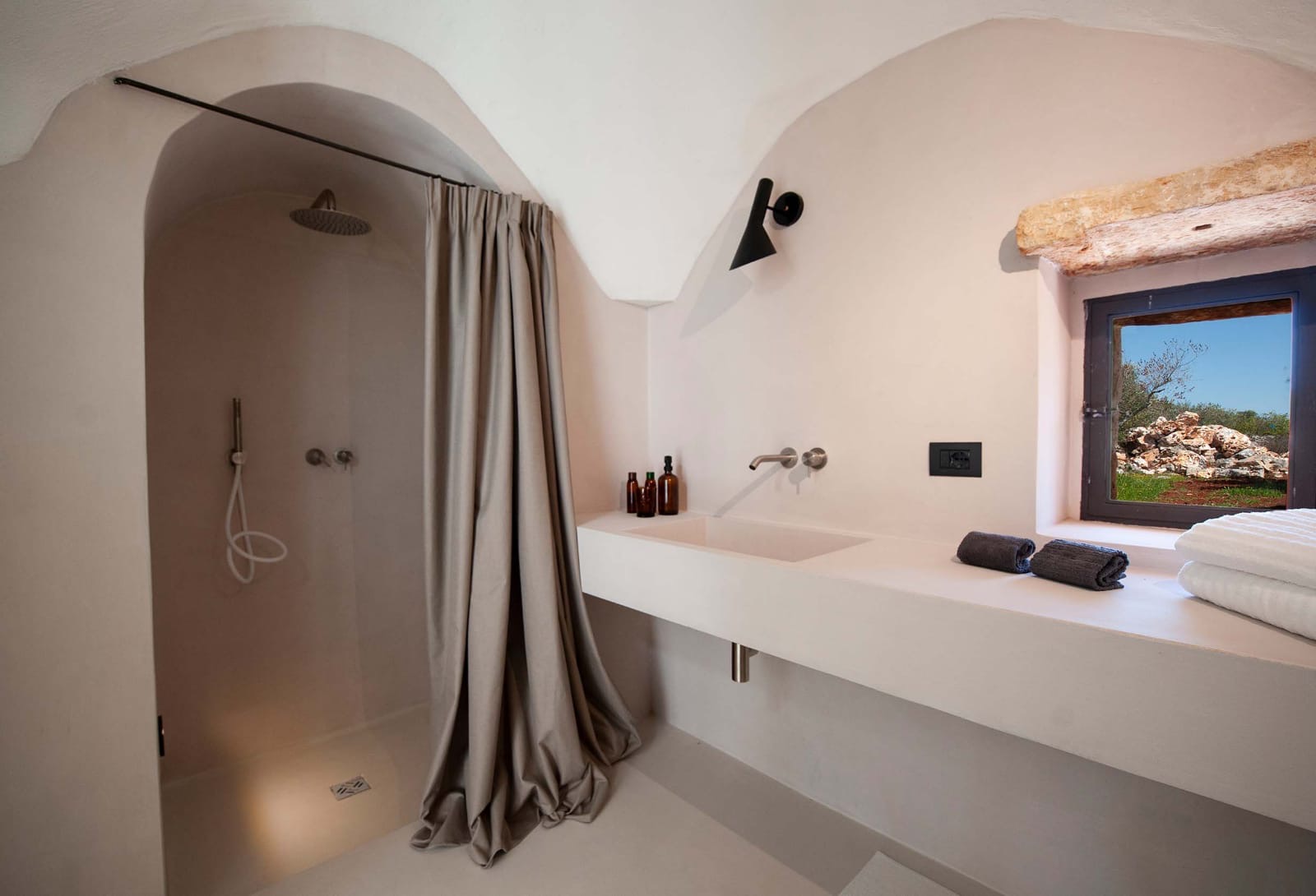 At the entrance of the property, a bit more secluded, stands another trullo featuring two double bedrooms, each with its own private bathroom.